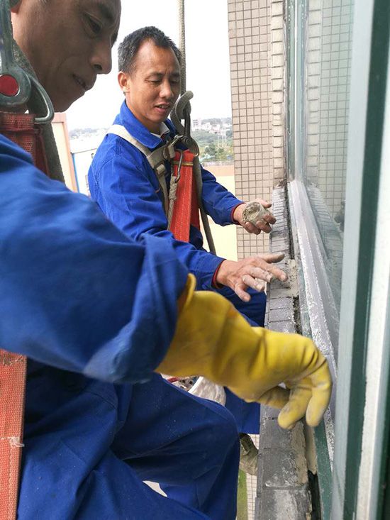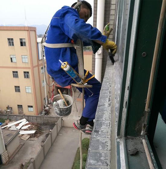 房屋外墙窗、飘窗、窗台、窗框等破损、缝隙、裂开的全面整体修补。采用吊绳吊板高空作业,至窗户外施工,检查修补外墙裂缝;窗框整体防水密封处理。