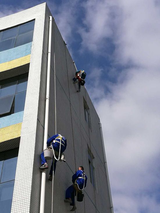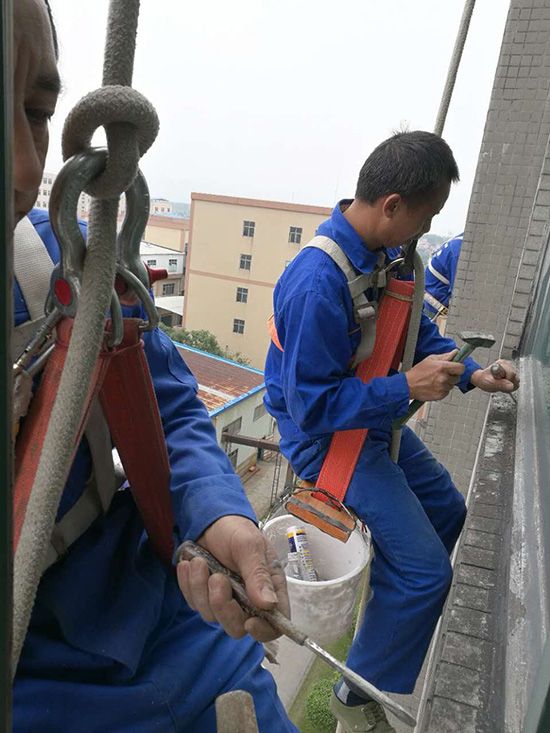 房屋外墙窗、飘窗、窗台、窗框等破损、缝隙、裂开的全面整体修补。采用吊绳吊板高空作业,至窗户外施工,检查修补外墙裂缝;窗框整体防水密封处理。